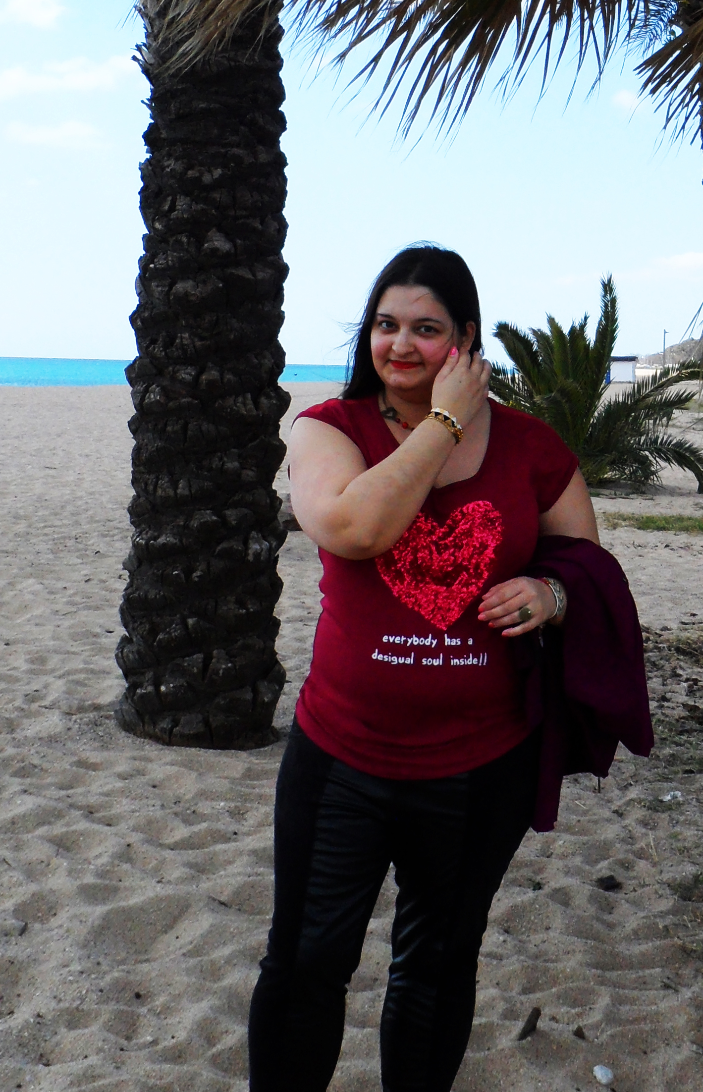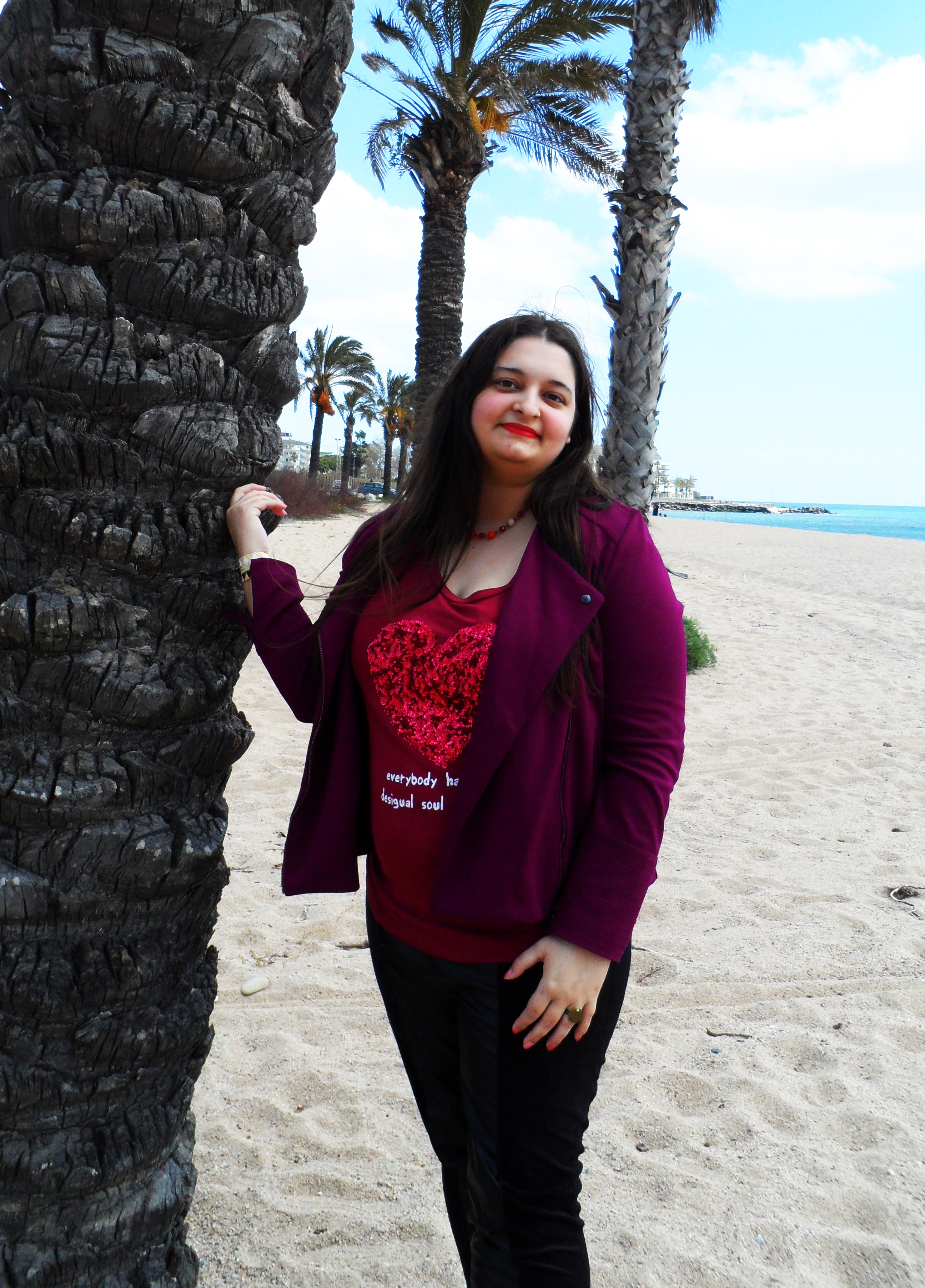 Hola! Hoy quiero enseñarte esta camiseta de lentejuelas de desigual que me dejo enamorada con este corazón y estos originales leggins de violeta by mango ! Una combinación diferente que termine con mi nueva chaqueta de promod en morado intenso! Fuimos a la playa pero hacia un viento terrible que casi se me lleva volando! Si! A mi!!! Por suerte he podido salvar estas fotos!
