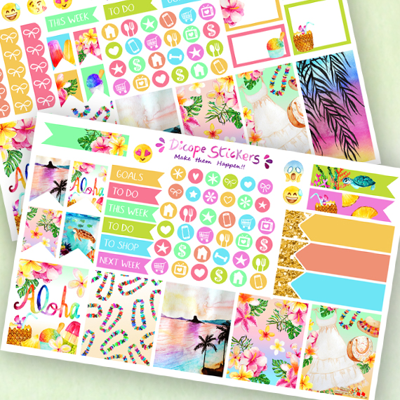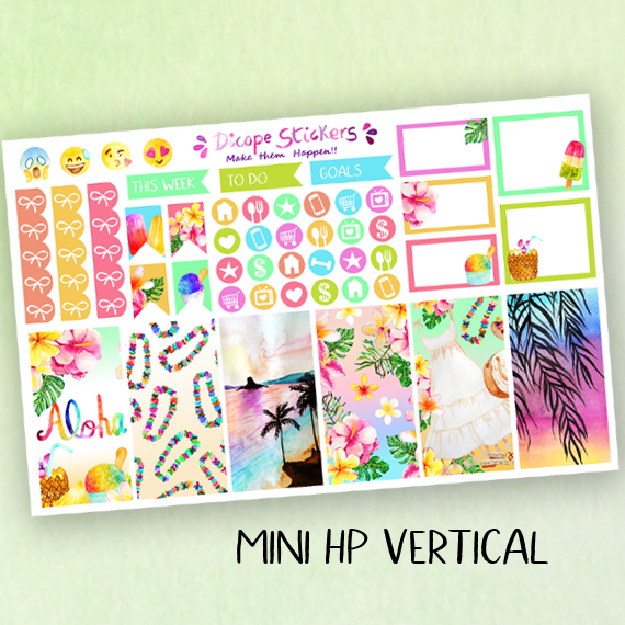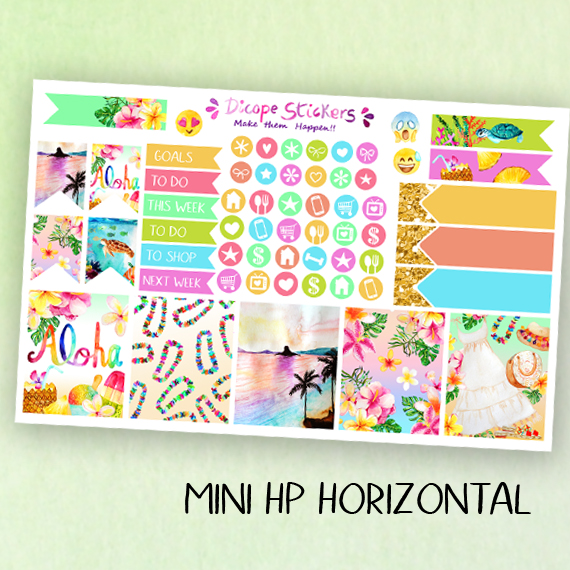 New aloha stickers kit for your mini Happy Planner! You can choose vertical or horizontal! Created in yellow, pink and mint colors. All with a gorgeous watercolor beach scene , an inside the ocean scene, hawaiian flowers and yummy pineapple , shaved ice and popsicles ! All painted by me ;)
