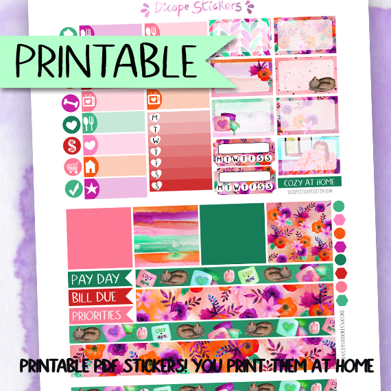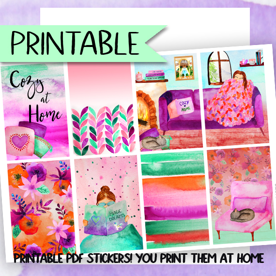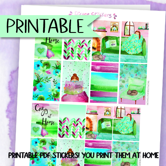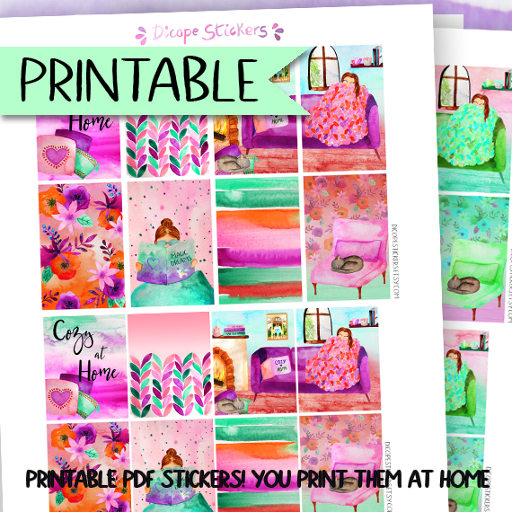 Cozy at Home deco box KIT Printable PDF Planner Stickers, with cute home cozy scenes and watercolor flowers perfect for fall or spring in 2 different colors kits ;) All painted by me!