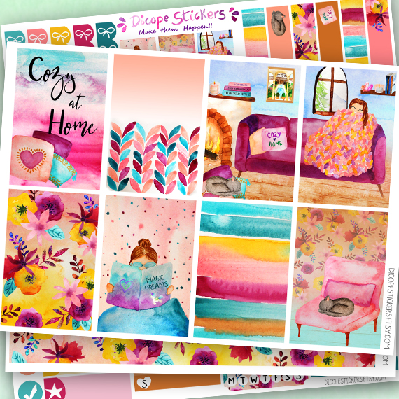 The Cozy at Home collection is here! Created in purple, pink and yellow colors. All with gorgeous watercolors florals , girl in the couch , girl reading , cute kitten and other lovely things! All painted by me ;)