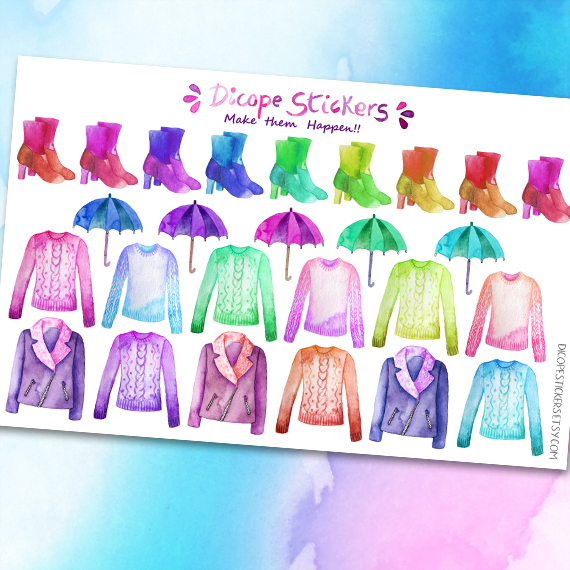 Fashion Watercolor Decorative Planner Stickers for You! This sheet includes several watercolor boots , umbrella , jackets and jumpers !! They are part of my Fall in Style Collection ♥