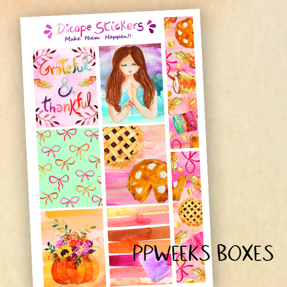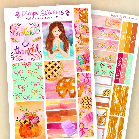 New thanksgiving stickers kit for your ppweeks Planner! Created in mint , yellow orange and pink colors with gorgeous watercolor pies , bows , words and girl! All painted by me ;)
