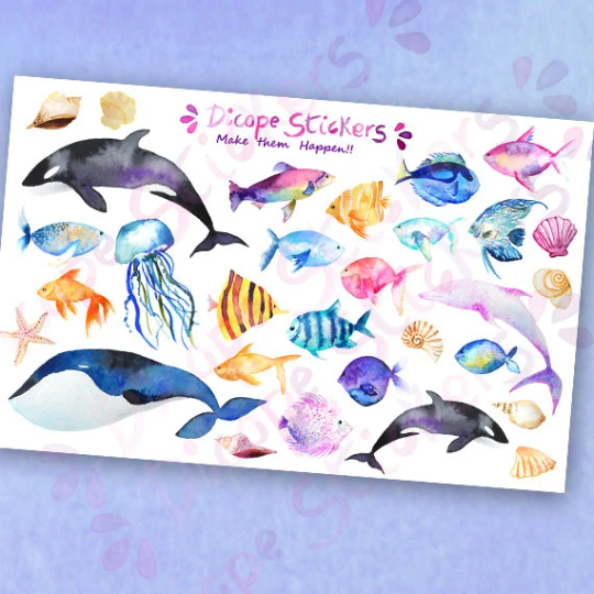 Watercolor Fish Dolphin and Whale Planners stickers to feel the magic of the sea! Perfect for scarpbooking and planning with gorgeous decor stickers!