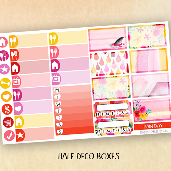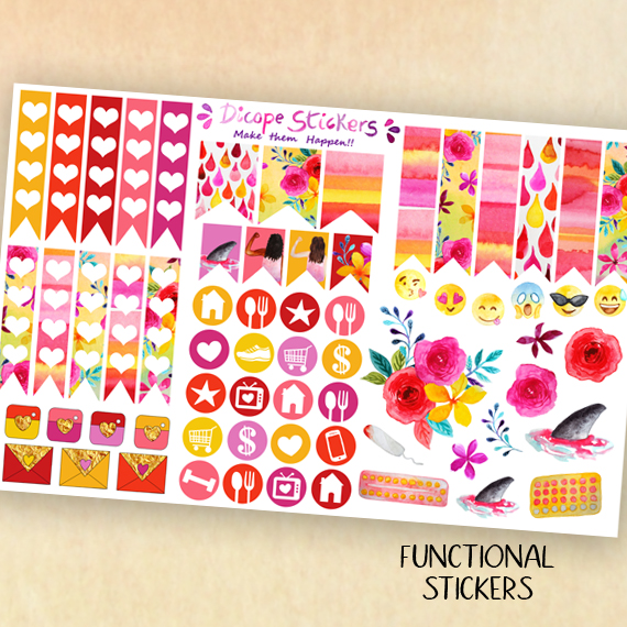 Here You have the 5 sheets kit that has 173 beautiful watercolored stickers that include 8 deco boxes (for classic size happy planner that allows space for headers or erin condren/recollections vertical planners ) 33 headers , 7 half boxes, 3 weekly goals boxes , 12 mini icon boxes and 110 lovely functional + decor and washi stickers!
