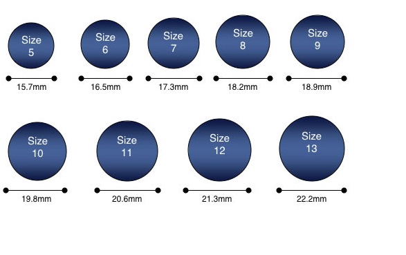 If it is a gift you can check the size with this image and a ring of the desired person. Place the ring on the size of the nearest circle. The inside edge of the ring should line up with the outside edge of the circle. If the ring seems to fit between two sizes, buy the larger size. Keep in mind that the image should be printed or sized following the millimeters in each circle size