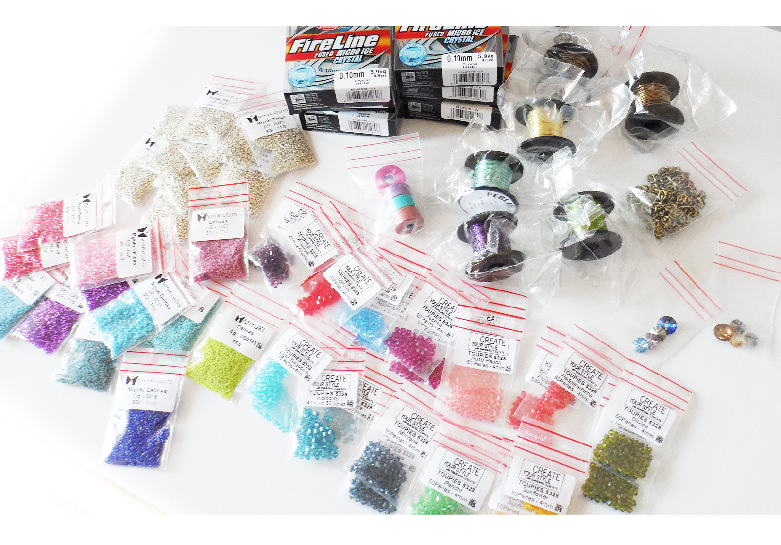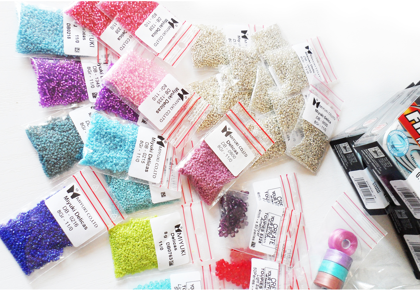 Hello sweeties ! Today I received more beads from my favorite shop Perles&Co ! Here you can see some of the miyuki delica seed beads and fireline thread that I use to make my wide bracelets !