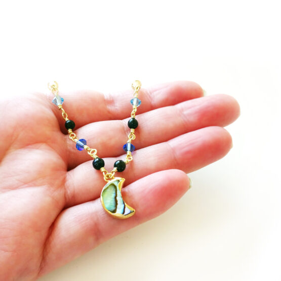 Magical necklace created with an abalone moon charm, sparkly blue goldstone gems and beautiful swarovski crystals in several blue colors. Perfect to wear with your favourite clothes!