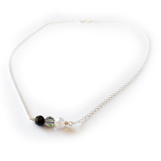 Minimalist and elegant Amaia necklace created with 3 beautiful swarovski beads in black , grey and opal white , all set in a lovely small sterling silver chain! Perfect to wear with your favorite work outfits!