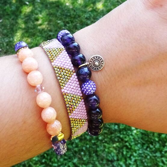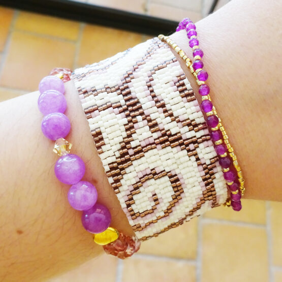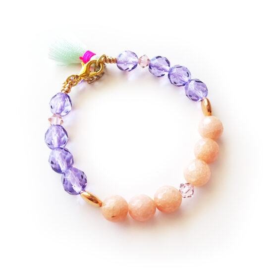 Lovely Aphrodite Bracelet handmade with gorgeous agate gemstone beads dyed in cream and purple colors! Each bracelet mixes with swarovski crystals and bohemian beads. Perfect to wear with your favourite outfits!