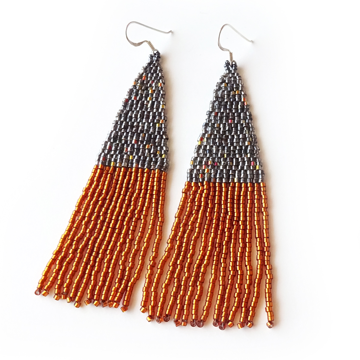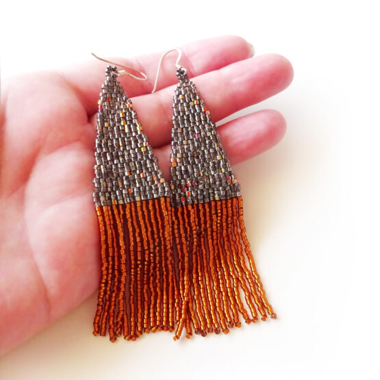 Amazing art deco beaded Earrings created in grey and cinnamon brown colors, all set in sterling silver earrings.