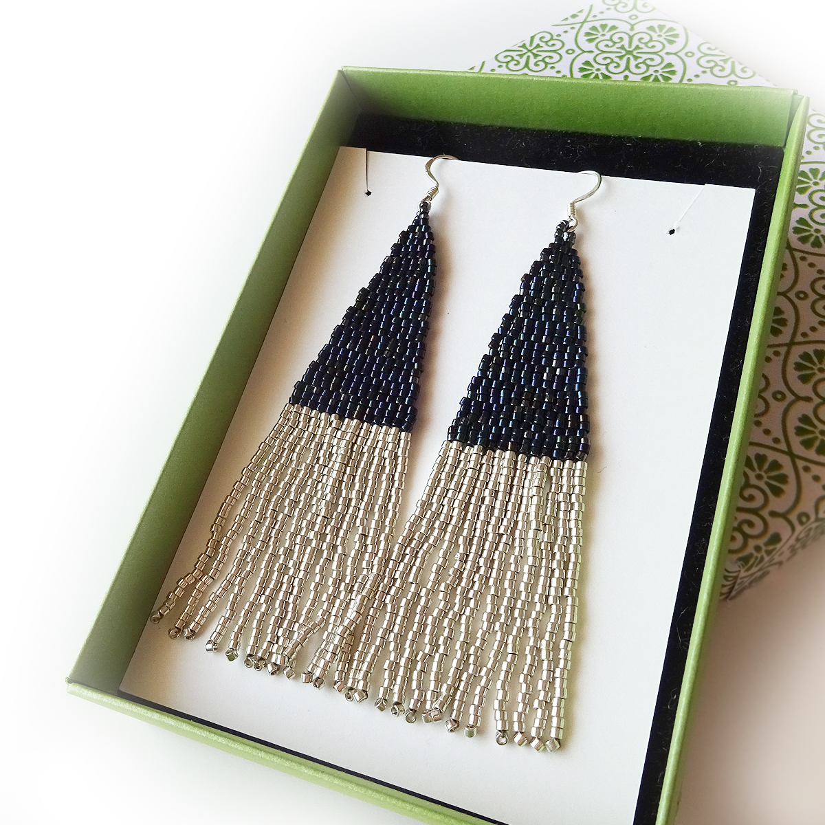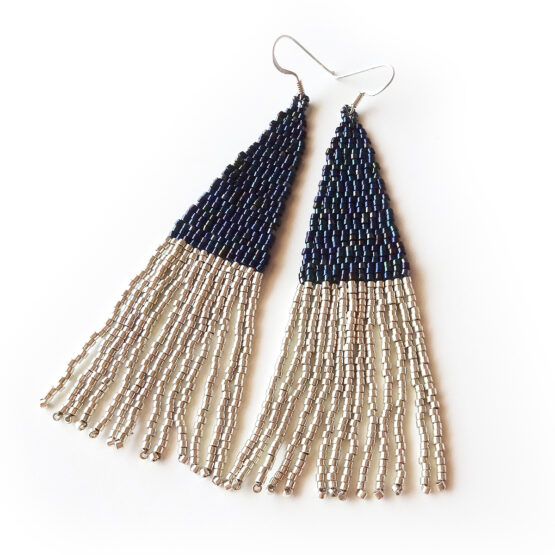 Amazing art deco beaded Earrings created in black and silver colors, all set in sterling silver earrings.