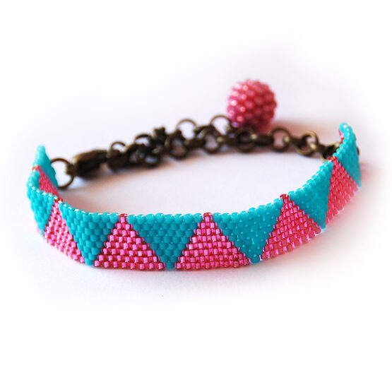 Created with more than 400 little glass beads laboriously beadwoven with a trendy triangle design in shimmering pink and sparkly turquoise blue colors. Set in a long bronze chain perfect for All sizes! The long chain allows for many sizes and gives a fun touch! Wear it to work to brighten your days or layer it up for a bohemian style!