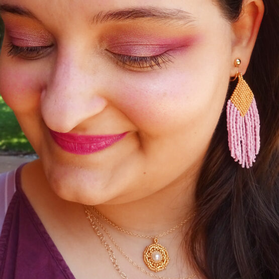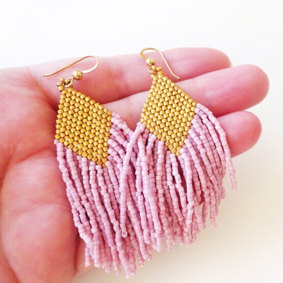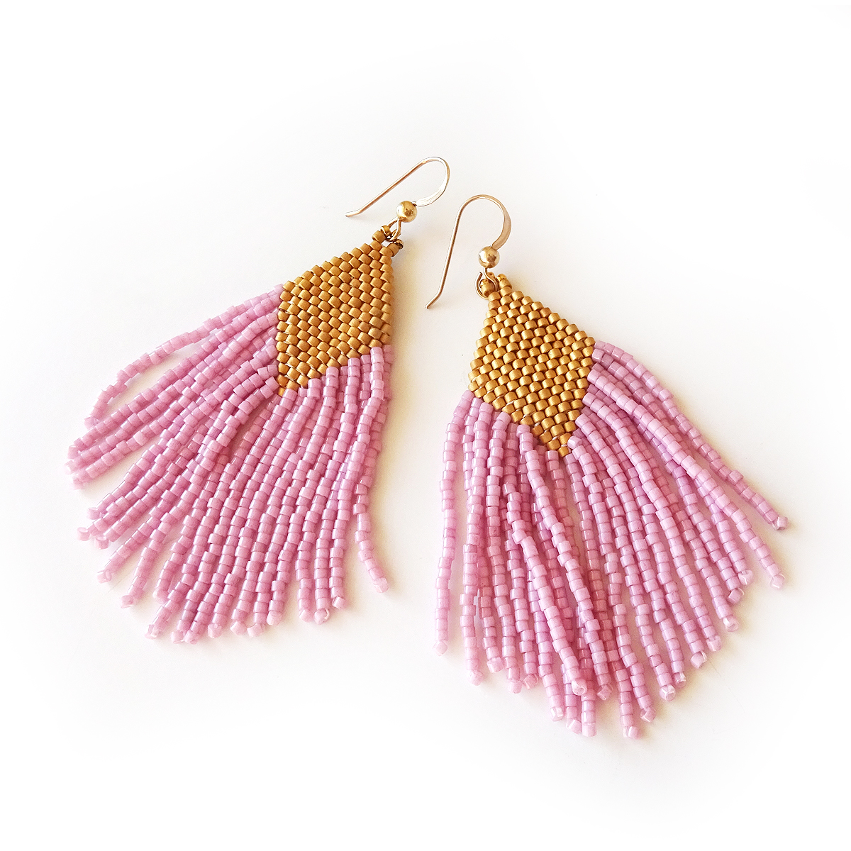 Lovely Boho Earrings created in vintage pink and mate 24kt gold dipped beads, all set in 14kt gold dipped earrings.