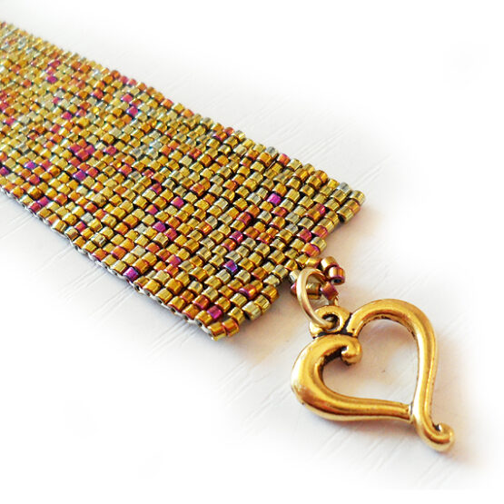 Elegant and Sexy bracelet handmade with best quality glass beads in bronze-gold iris and gold colors , and an easy to use gold plated heart clasp ! An exquisite jewel of more than a 1500 beads and 4 hours of work !