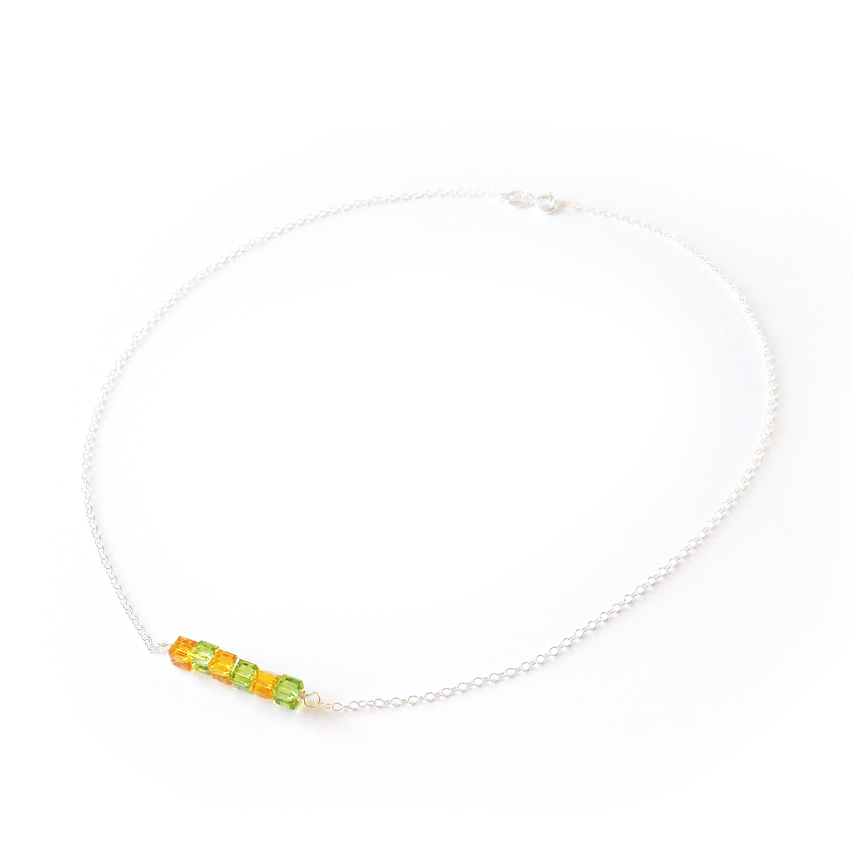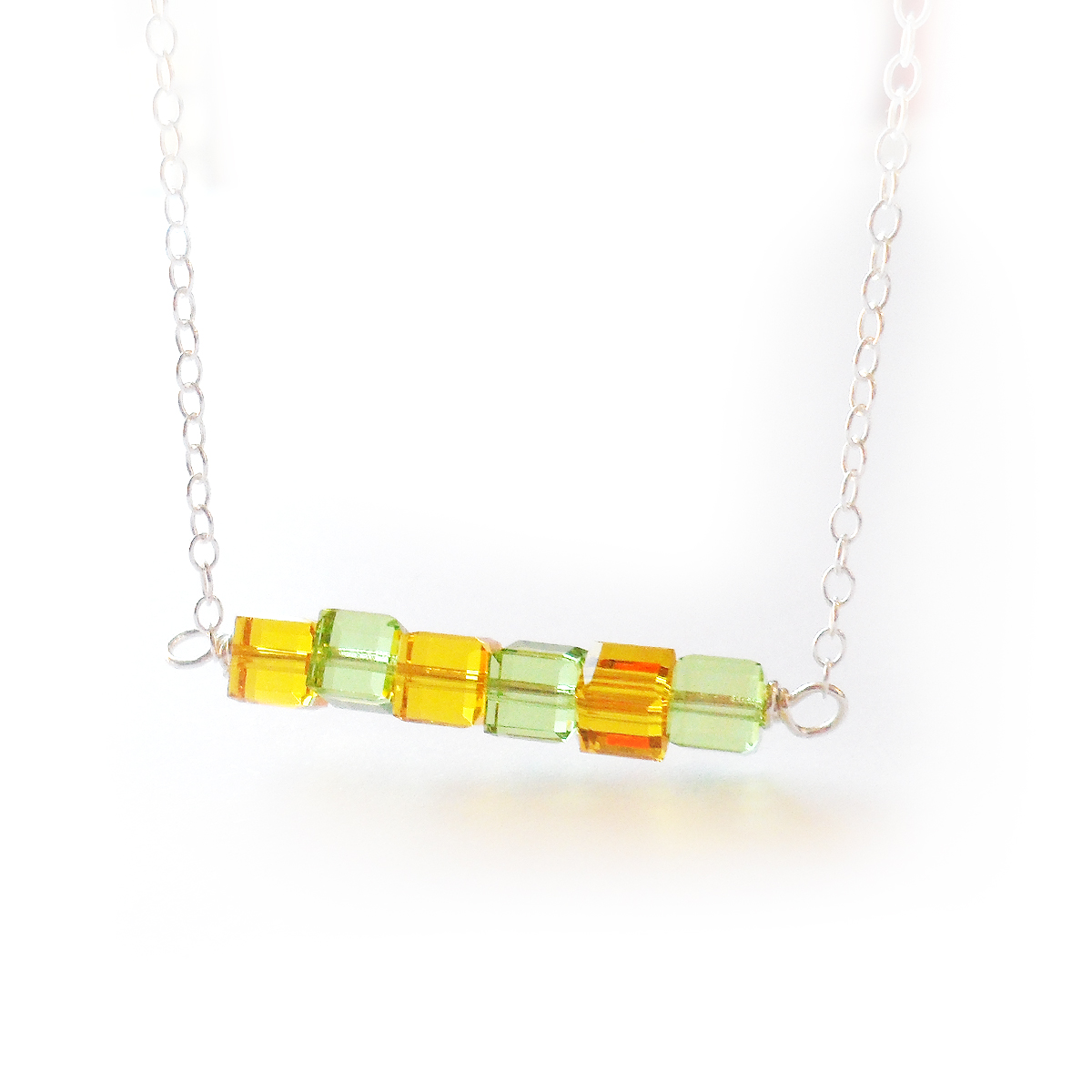 Elegant and delicate Calipso necklace created with 4mm Swarovski crystal sparkly cubes in yellow and green colors, all set in a lovely small sterling silver chain! Perfect to wear with your favorite work outfits!