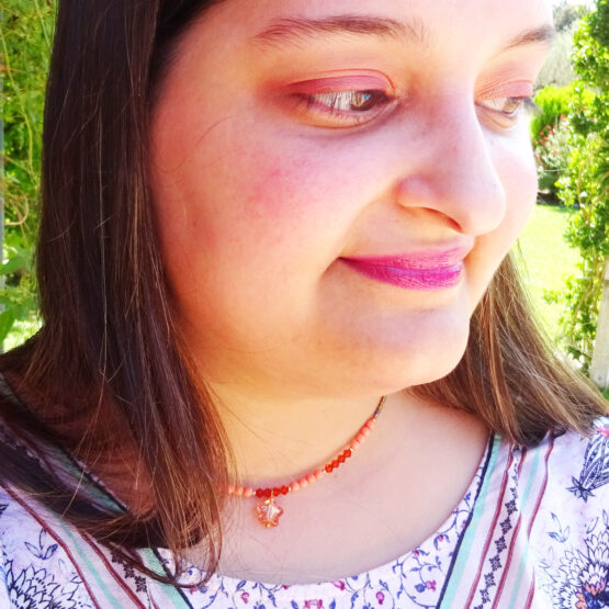 Sweet Shiny Star necklace created with a sparkly glass bead and lovely coral glass beads and swarosvki crystals.