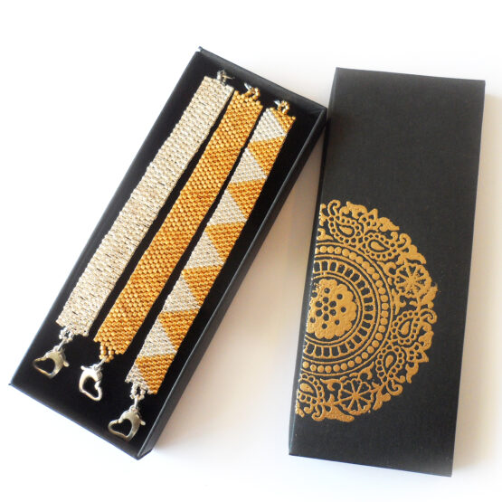 Created with more than 400 little glass beads laboriously beadwoven with a trendy triangle design dipped in sterling silver and 24kt gold. Set in a long sterling silver chain and components perfect for All sizes! The long chain allows for many sizes and gives a fun touch! Wear it to work to brighten your days or layer it up for a bohemian style!