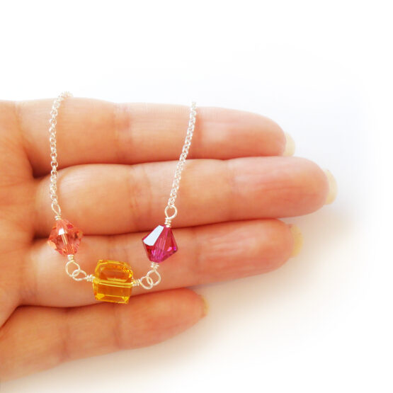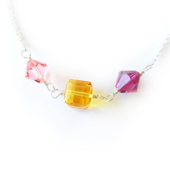 Celebrate everyday with this modern and elegant Cristina necklace created with a cube and two diamond shaped swarovski beads in pink and yellow colors, all set in a sterling silver chain! This necklace is a new version of my dainty necklaces with bigger beads and chain that stands out more without being too much!