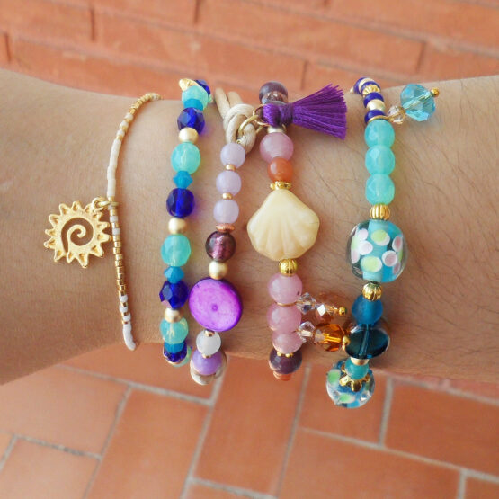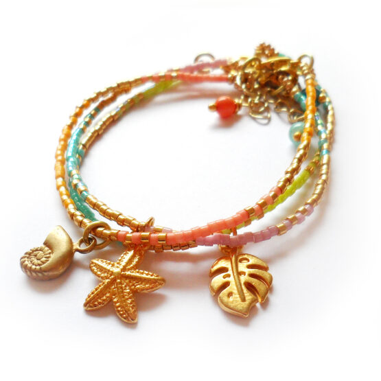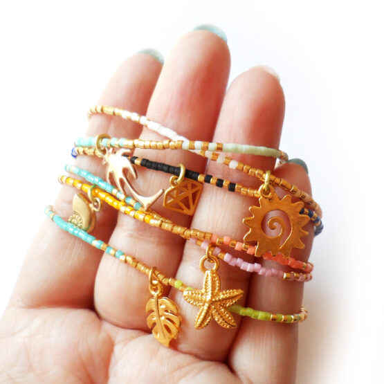 Dream with your favourite beach with these lovely bracelets created with glass beads that mix gold and mint , coral , turquoise , orange colors perfect for your daily outfits! Each bracelet has a different gold charm ! Choose your favourite : Leaf , Starfish , Palmtree , Sun , Seashell and Diamond