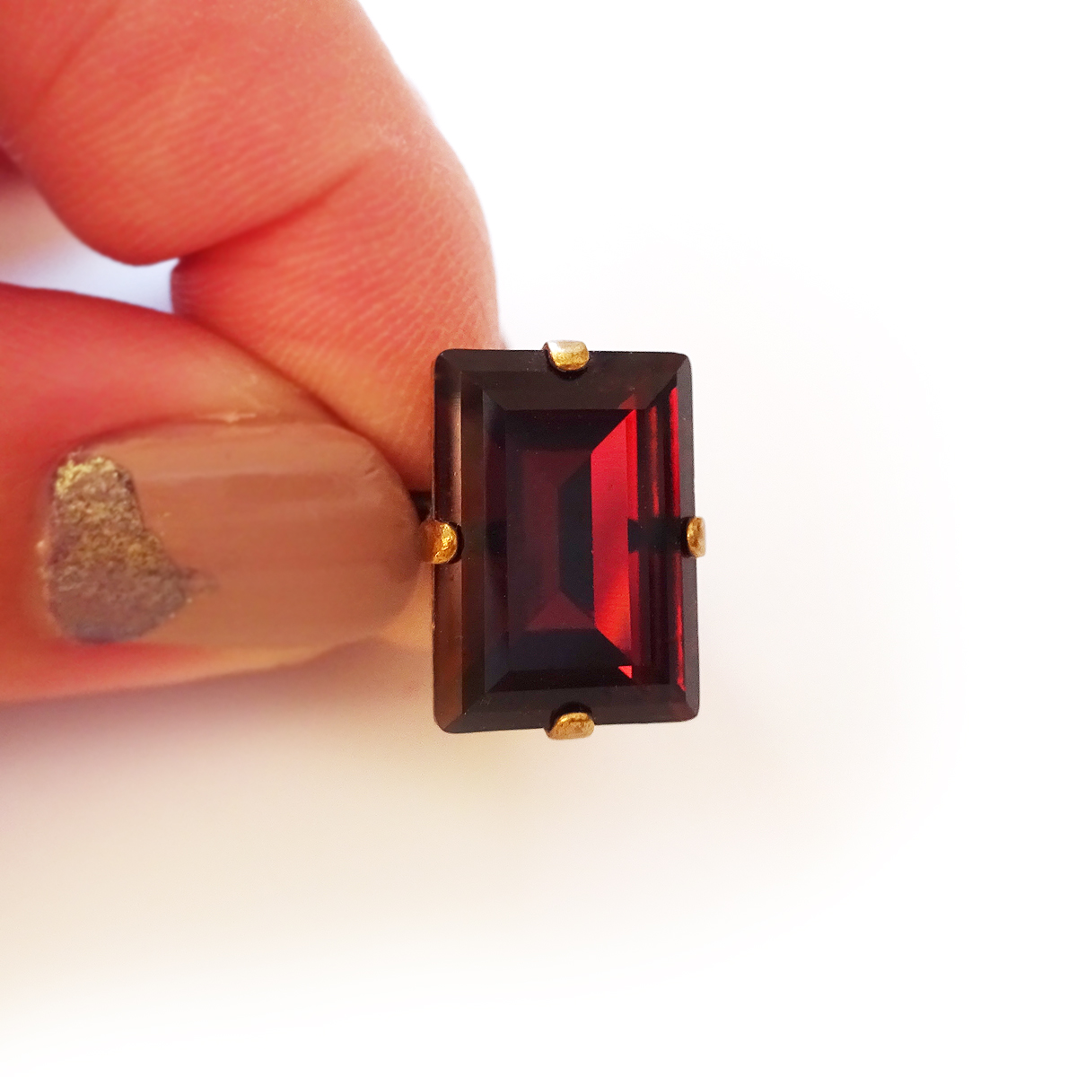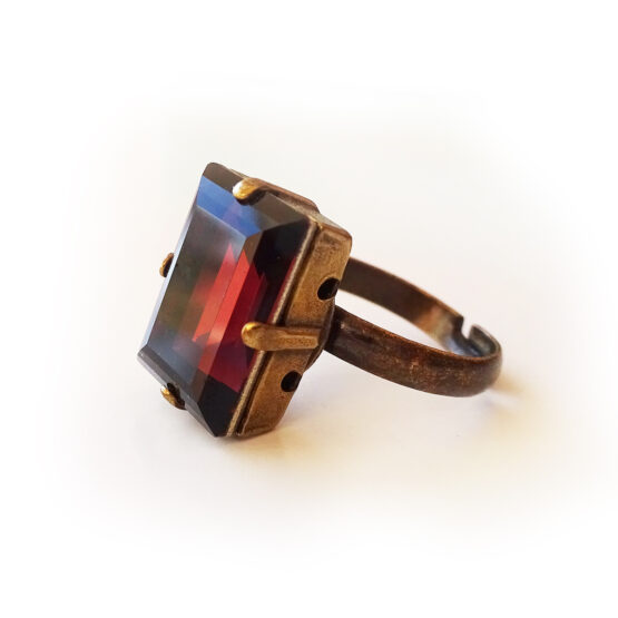 Sparkle everyday with this beautiful rectangle emerald cut ring , created with a gorgeous swarovski crystal rhinestone in wine deep red color and set in a bronze adjustable ring base.