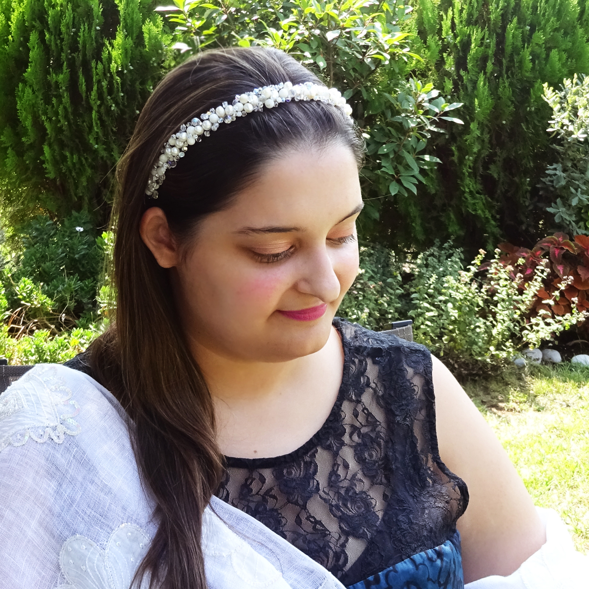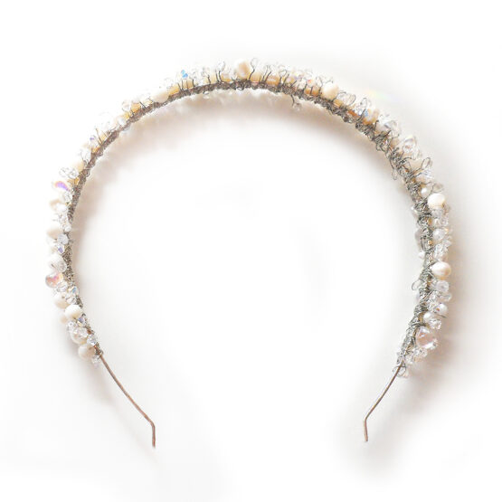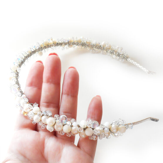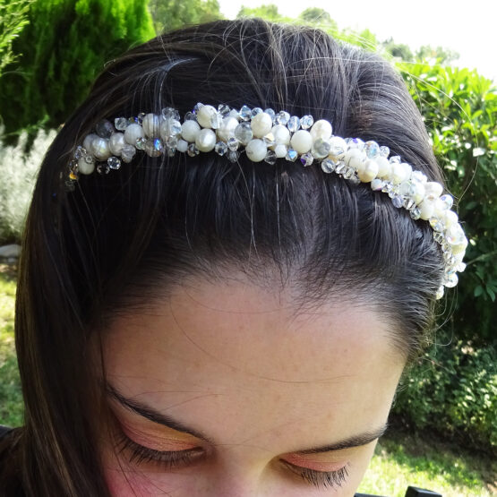 Amazing bridal headband created with freshwater pearls, mother of pearl beads and swarovski crystals in white shades