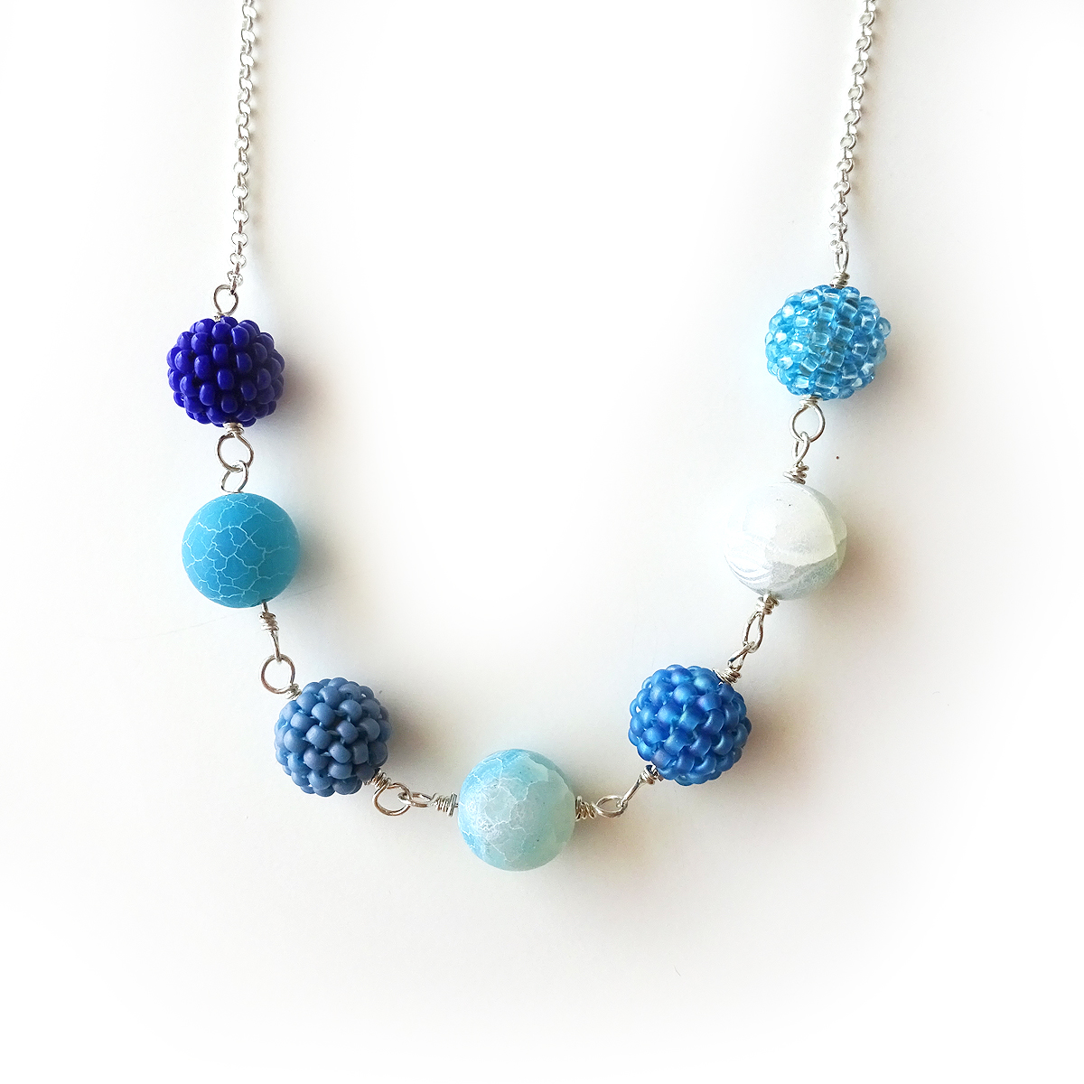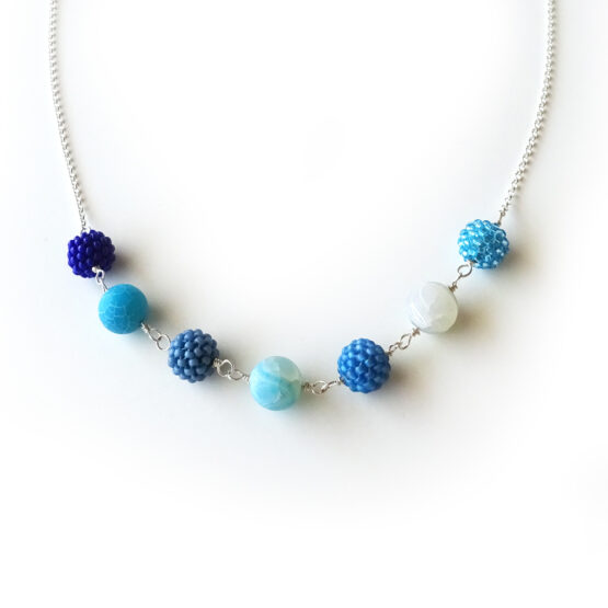 Beautiful Freya necklace handmade with my amazing little berry beads created with the best quality tiny glass beads adding them one by one in blue colors. And gorgeous matte agate beads in blue shades, all set in sterling silver.