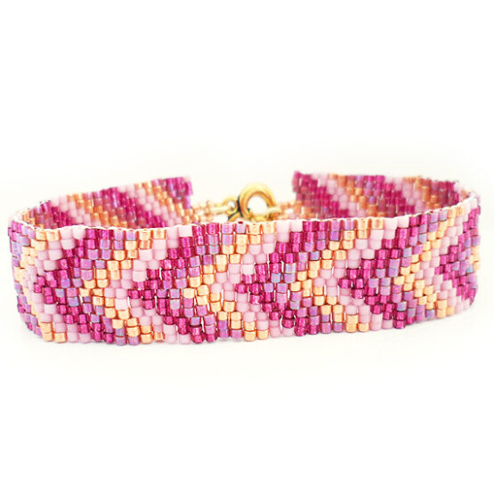 Elegant and Sexy friendship bracelet handmade with best quality glass beads in pink , purple and gold colors in an original Dicope Bisuteria pattern ! An exquisite jewel of more than a 1000 beads (4 hours of work !! ) and an easy to use gold plated heart clasp.