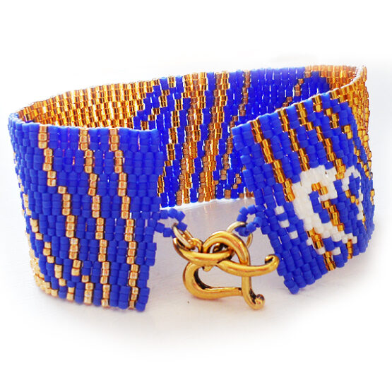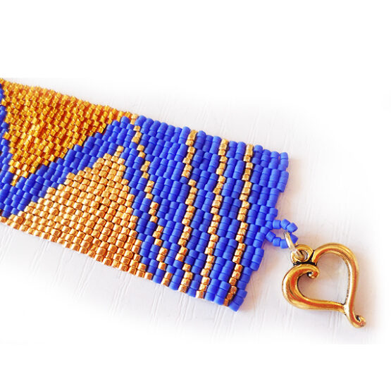 Elegant and Sexy geometric bracelet inspired in the egyptian pyramid nights and handmade with best quality glass beads in blue and several gold colors ! An exquisite jewel of more than a 2000 beads and an easy to use gold plated clasp.