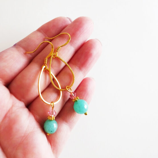Lovely metal drop Earrings created with gemstone agate beads and swarosvki crystals, all set in gold plated hoops.