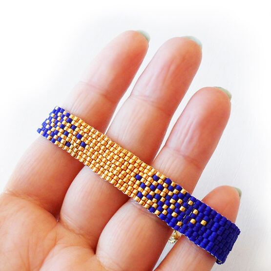Created with more than 400 little glass beads laboriously beadwoven in a trendy ombre gradient design in dark blue and shimmering gold colors. Set in a long gold plated chain perfect for All sizes! The long chain allows for many sizes and gives a fun touch! Wear it to work to brighten your days or layer it up for a bohemian style!