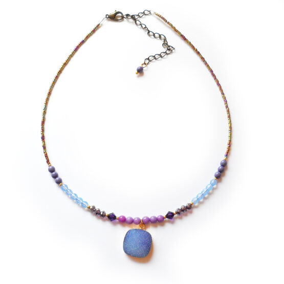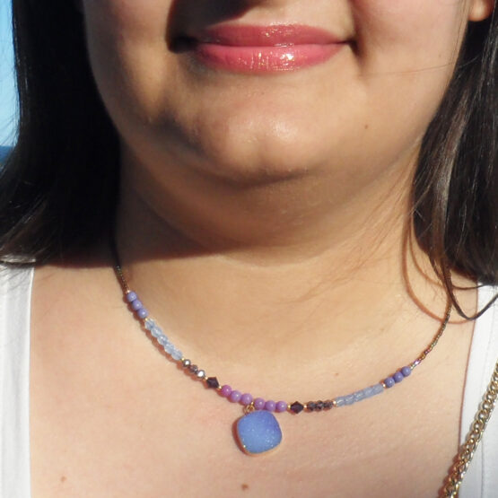 Amazing necklace created with a sparkly lavander druzy agate gemstone charm electroplated in 22kt gold ! Set between gorgeous lilac agate gemstone beads , swarovski crystals and several glass beads! Perfect to give an magical touch to your favourite outfits!