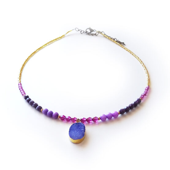 Gorgeous necklace created with a sparkly lilac druzy agate gemstone charm electroplated in 22kt gold ! Set between swarovski crystals and several glass beads! Perfect to give an summer touch to your favourite outfits!