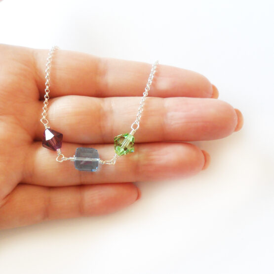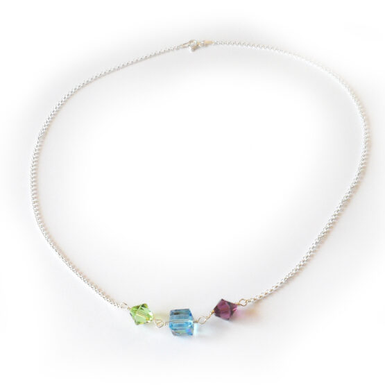 Celebrate everyday with this modern and elegant Marta necklace created with a cube and two diamond shaped swarovski beads in green blue and purple colors, all set in a sterling silver chain! This necklace is a new version of my dainty necklaces with bigger beads and chain that stands out more without being too much!