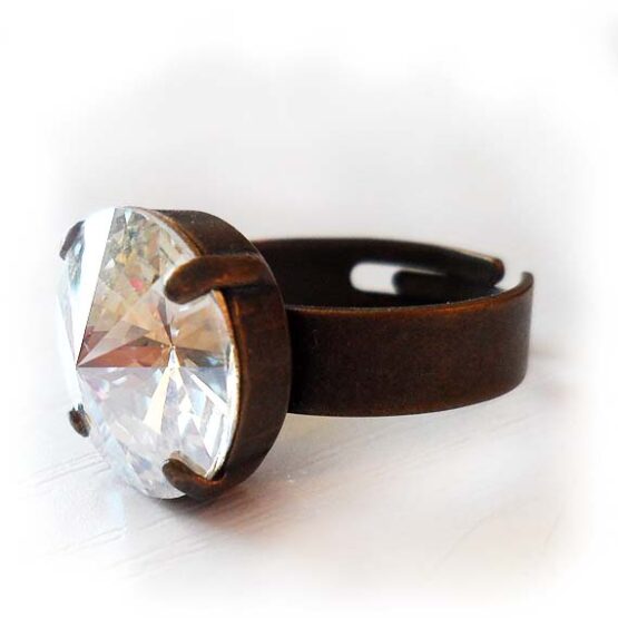 Amazing shimmering moonlight swarovski cristal round cut ring created with a gorgeous swarovski crystal rhinestone in shimmering cristal color and set in a bronze adjustable ring base.