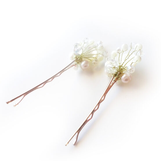 Are you looking for a small jewel to decor for your hairstyle? These beautiful hair pins are created with mother of pearl drops and beads, swarovski crystals and freshwater pearls in white shades.
