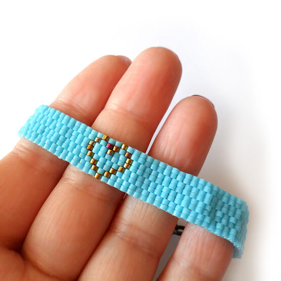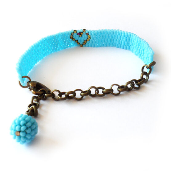 Created with more than 400 little glass beads laboriously beadwoven with a trendy heart design in shimmering dark gold and sky blue colors. Set in a long bronze chain perfect for All sizes! The long chain allows for many sizes and gives a fun touch! Wear it to work to brighten your days or layer it up for a bohemian style!