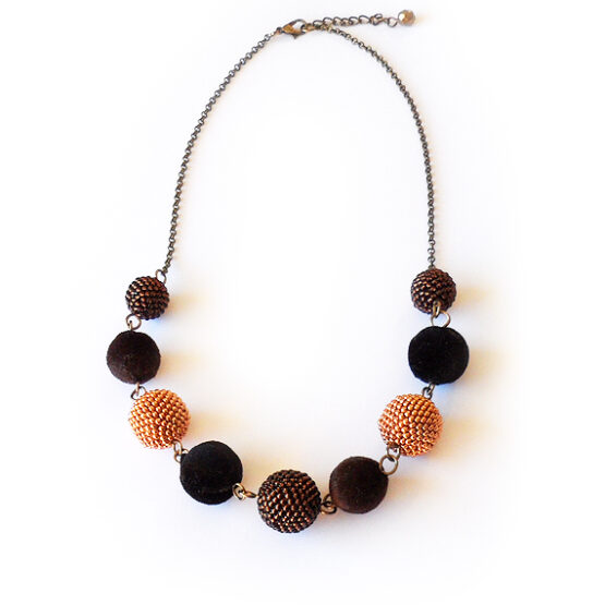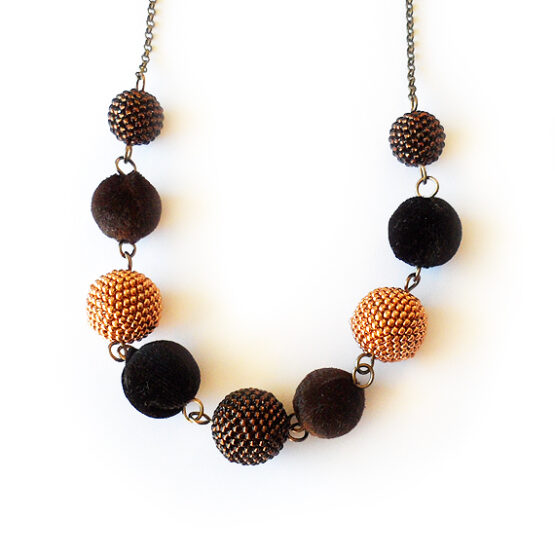 Original and Elegant New Years Eve necklace created with brown and black velvet beads and handmade beadwoven beads made by me around wood balls in several brown and gold colors!