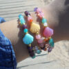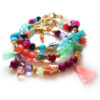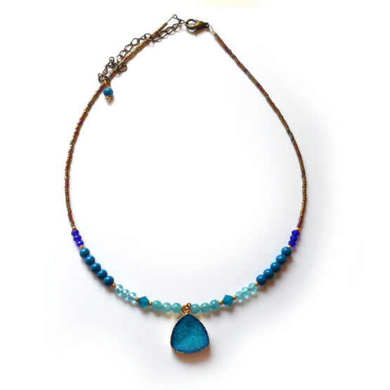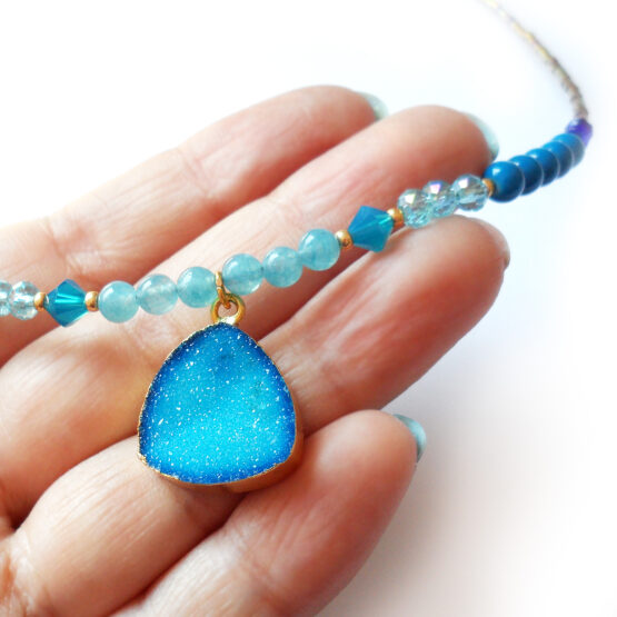 Beautiful necklace created with a sparkly ocean blue druzy agate gemstone charm electroplated in 22kt gold ! Set between gorgeous aquamarine gemstone beads , swarovski crystals and several glass beads! Perfect to give an magical touch to your favourite outfits!