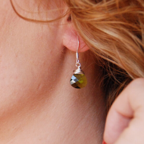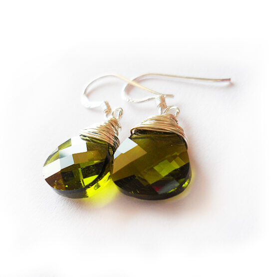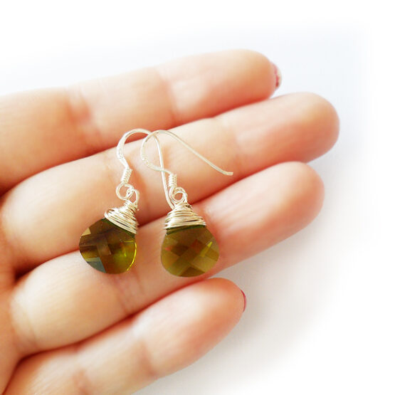Shine everyday with this drop faceted earrings created with mini gorgeous shimmering swarovski crystals in olivine green color , wrapped in sterling silver wire and set in sterling silver hoops. Perfect to wear everyday in a dainty look!