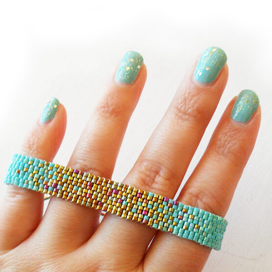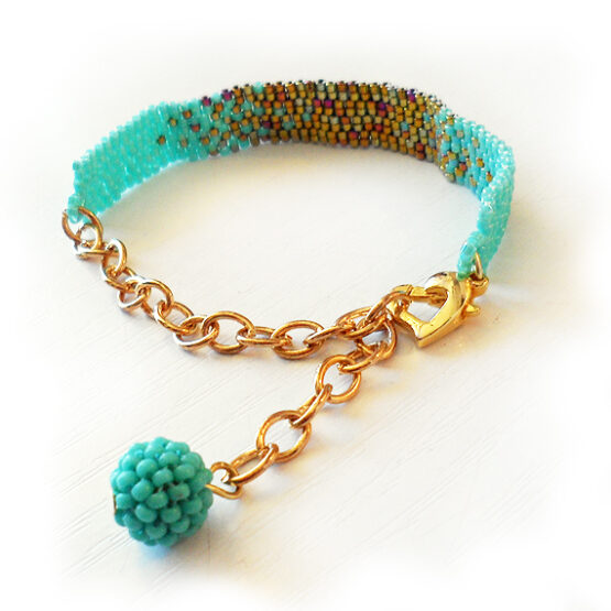 Created with more than 400 little glass beads laboriously beadwoven in a trendy ombre gradient design in sparkly turquoise blue and dark gold color with a rainbow shine finish. Set in a long gold plated chain perfect for All sizes! The long chain allows for many sizes and gives a fun touch! Wear it to work to brighten your days or layer it up for a bohemian style!