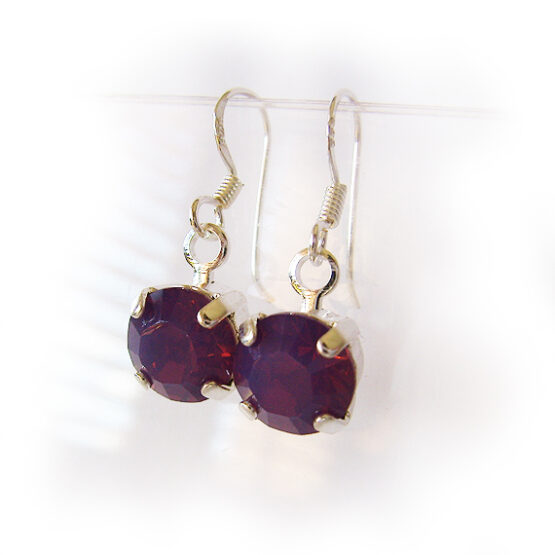 Elegant round rhinestone faceted earrings created with gorgeous sparkly swarovski crystals in opal purple color and set in sterling silver hoops.