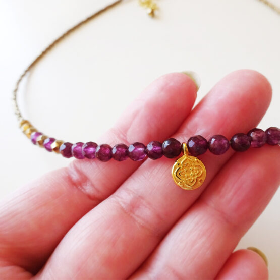 The perfect everyday necklace created with a tiny gold plated coin charm and gorgeous faceted purple agate gemstones!