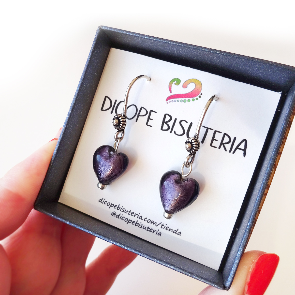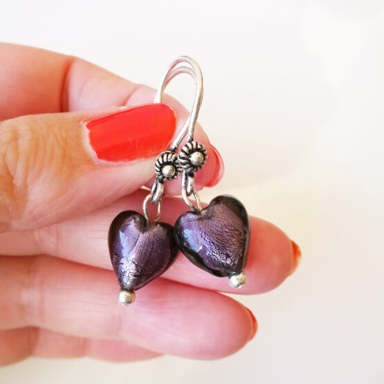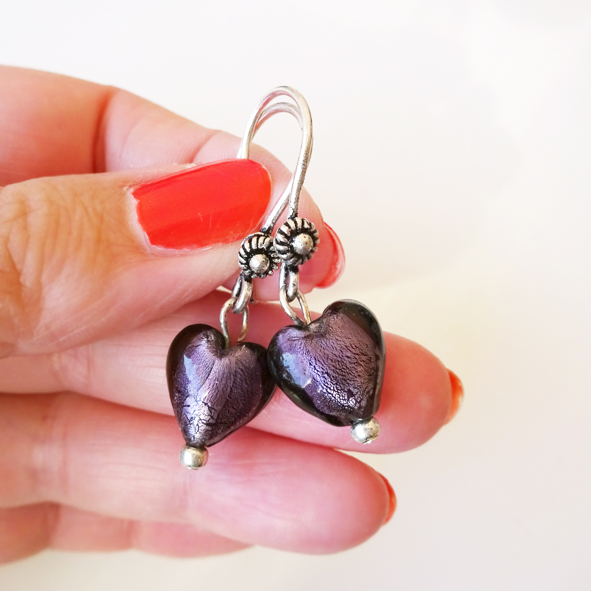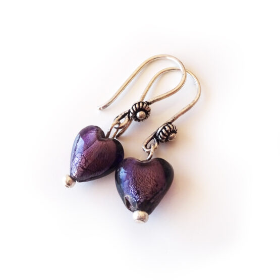 Purple Heart Earrings created with shiny glass hearts, all set in silver plated hoops.