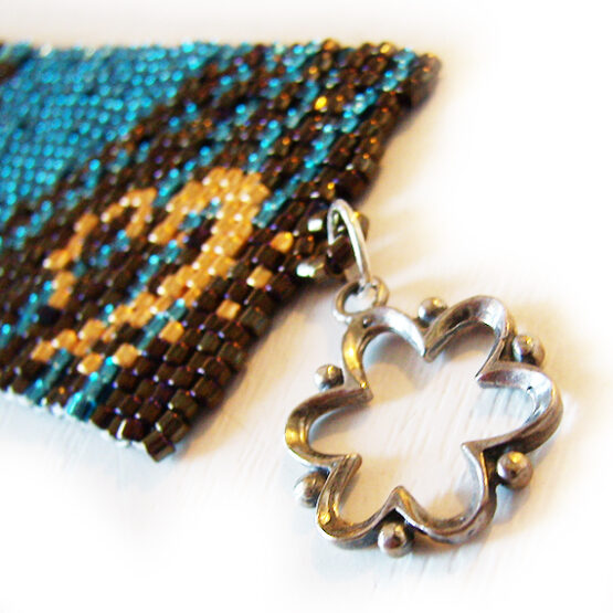 Elegant and Sexy geometric bracelet handmade with best quality glass beads in teal blue , turquoise and dark brown colors ! An exquisite jewel of more than a 2000 beads and an easy to use sterling silver clasp.