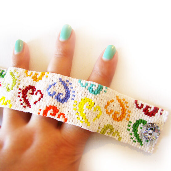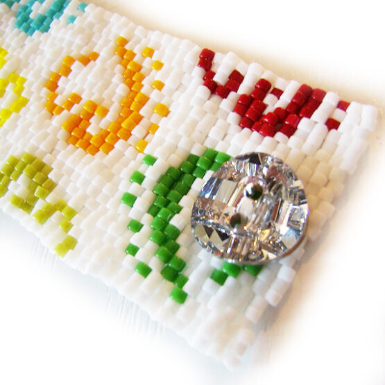 Elegant and Sexy dicope logo bracelet handmade with best quality glass beads in a rainbow of colors ! An exquisite jewel of more than a 2000 beads and an easy to use swarovski button clasp .