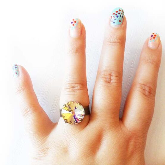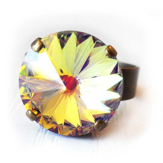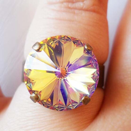 Shine everyday with this big round ring created with a gorgeous swarovski crystal rhinestone in a shimmering purple lilac yellow color and set in a bronze adjustable ring base.