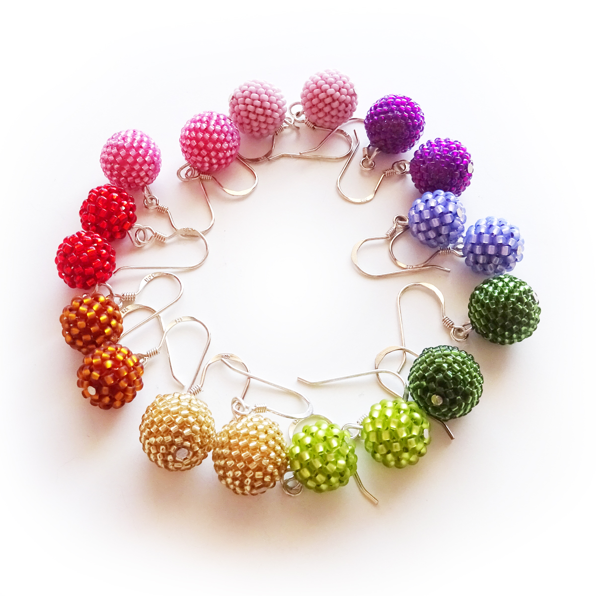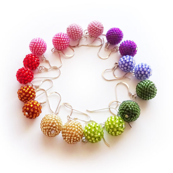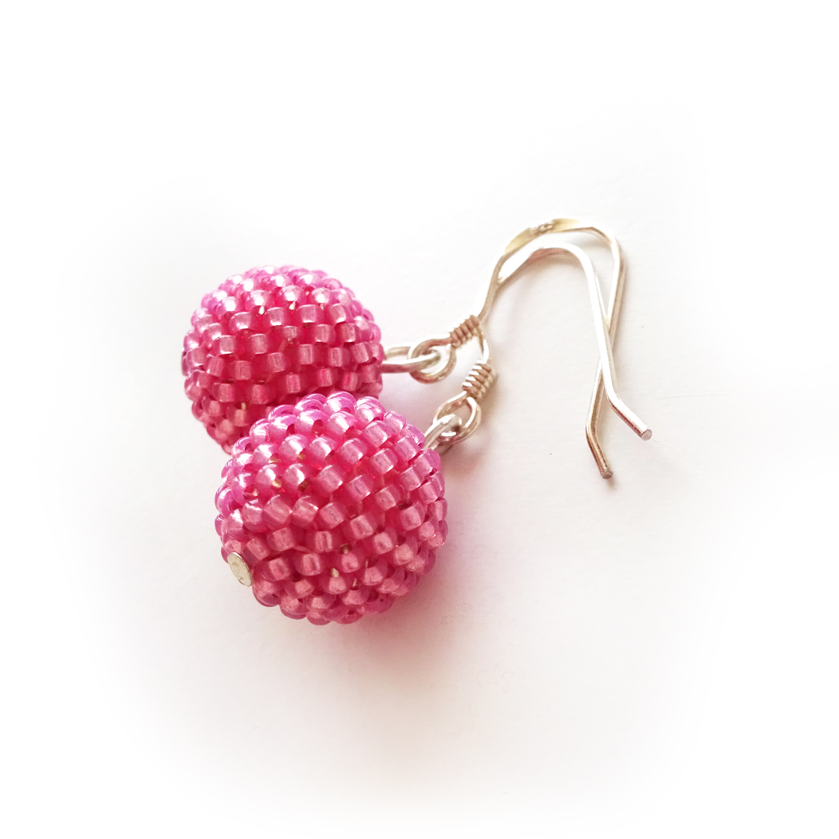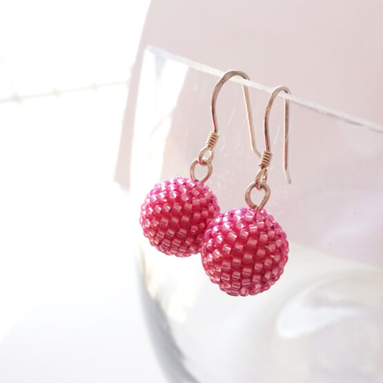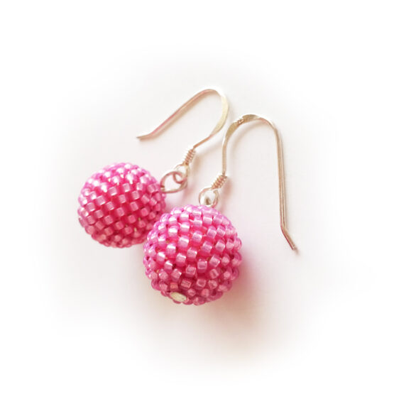 Elegant and Original Beadwork earrings handmade with two of my siny pink beads beadwoven in first quality glass beads around wood balls. They are so light and comfortable ! A joy to wear with your favourite outfits ! All set in sterling silver hoops.