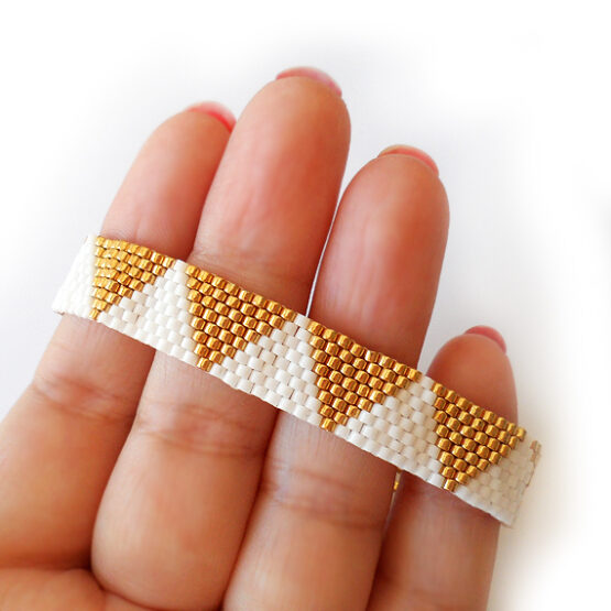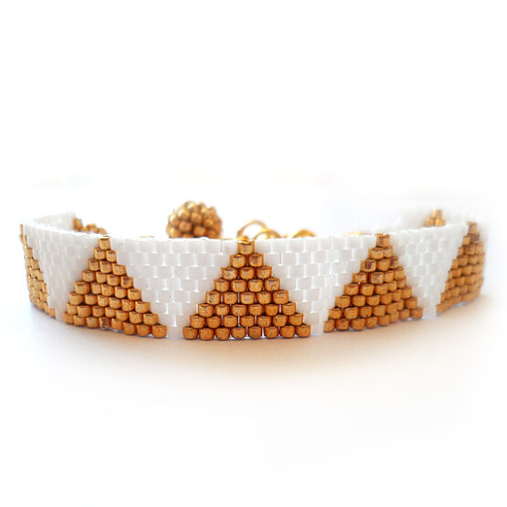 Created with more than 400 little glass beads laboriously beadwoven with a trendy triangle design in shimmering gold and white colors. Set in a long gold plated chain perfect for All sizes! The long chain allows for many sizes and gives a fun touch! Wear it to work to brighten your days or layer it up for a bohemian style!