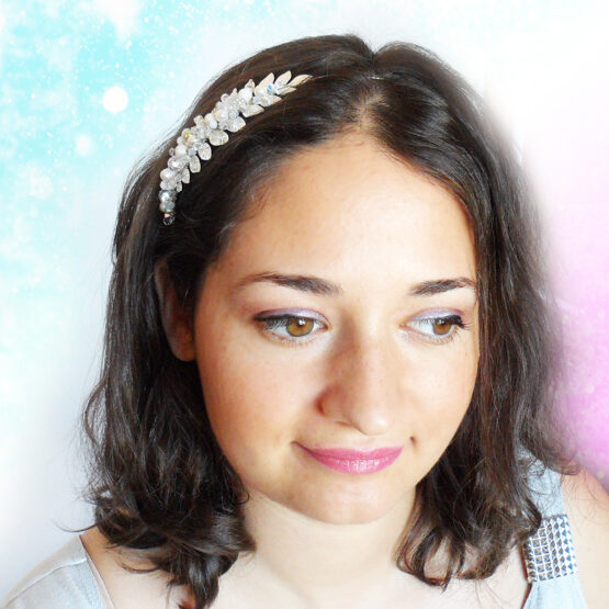 Lovely headband created with silver leaves, swarovski crystals, pearls and glass drop beads in silver and white shades . Perfect for a magical look for parties and weddings