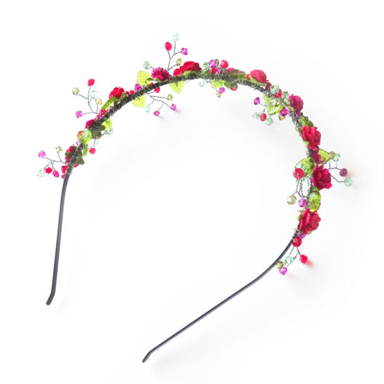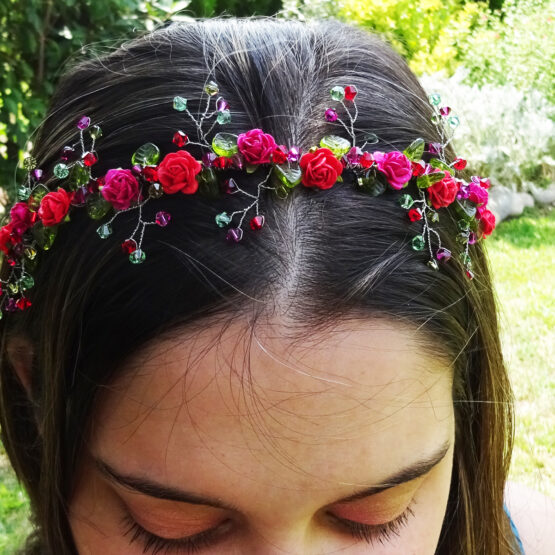 Lovely headband created with small red rose paper flowers and swarovski crystals beads in pink and green shades . Perfect for a magical look for parties and weddings